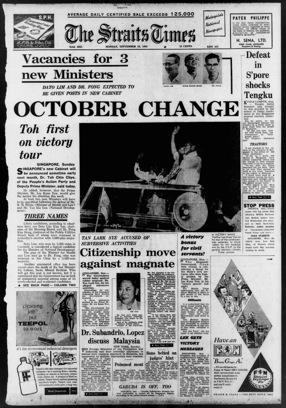 Despite contesting for nine seats, [16] the PAP only managed to win a single seat with Devan Nair securing the Bangsar constituency in Kuala Lumpur. [17] [18] Albert Lau considered that the PAP lost whatever leverage it might have had in its electoral defeat, and relations between the PAP and the Alliance only further worsened. [15] On 25 May, Malaysian finance minister Tan Siew Sin, who was also the president of the Malayan Chinese Association (MCA), warned that PAP would be a main threat to the Alliance and expected a "big fight" in the 1969 elections. [19]