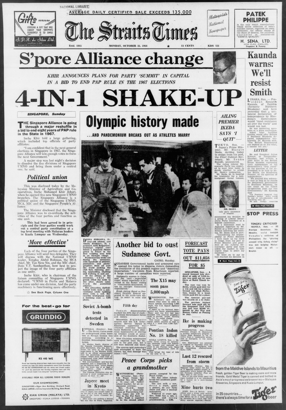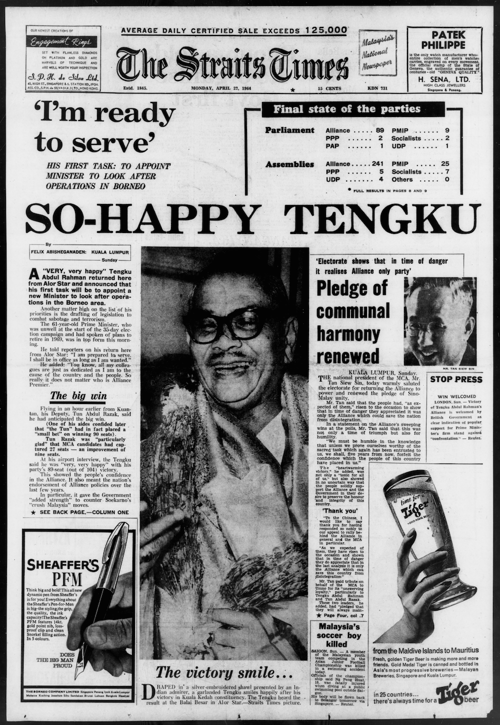 Singapore became part of Malaysia on 16 September 1963. [1] Shortly after merger, Singapore held its general elections on 21 September, which were also contested by the Singapore Alliance, the local counterpart of the ruling Alliance Party in Malaya. [2] Although the Malaysian prime minister Tunku Abdul Rahman and Singapore's prime minister Lee Kuan Yew had a "tacit agreement" not to interfere in each other's politics, the Malaysian leaders, including the Tunku, had come to Singapore to campaign for the Singapore Alliance. [3]