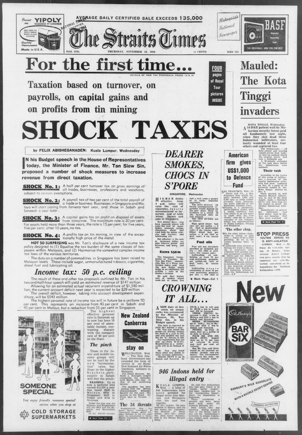Further tensions between the federal government and Singapore arose as the PAP criticised Malaysian finance minister Tan Siew Sin's controversial tax proposals in November 1964 that was intended to address the Konfrontasi. [44] In response to PAP's criticisms, Tan threatened to increase Singapore's revenue contribution to the Central Government from 40 to 60 per cent. [45] Following additional delays in the release of development loans to Sabah, Tan renewed his threat to raise the tax in July 1965, [46] a move rejected by Singapore's finance minister Goh Keng Swee. [47] Lee planned to bring the matter before the World Bank for arbitration. [48]