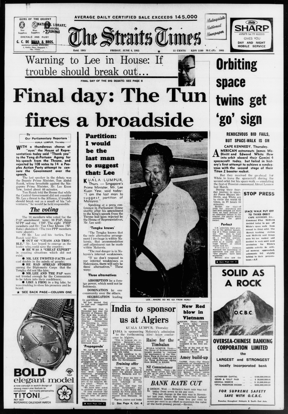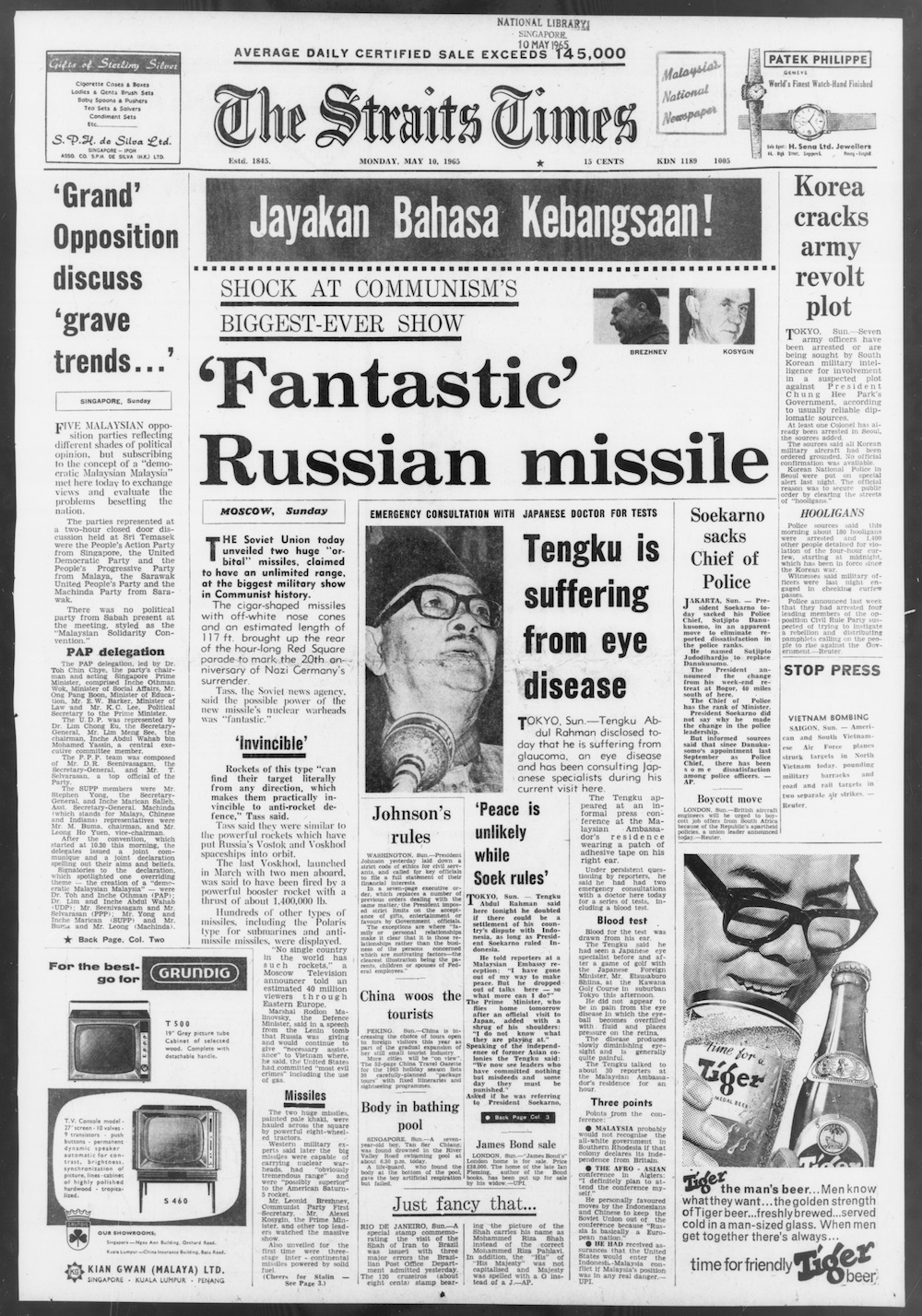 This document detailed the Tunku's visit to Singapore on 15 February 1965, during which he opened the new Singapore UMNO House. Lee observed that the British may have advised the Tunku against "hiving off" Singapore because the left-wing Barisan Sosialis was still active, thereby reinforcing the Tunku's decision to retain control over Singapore's internal affairs. [80]