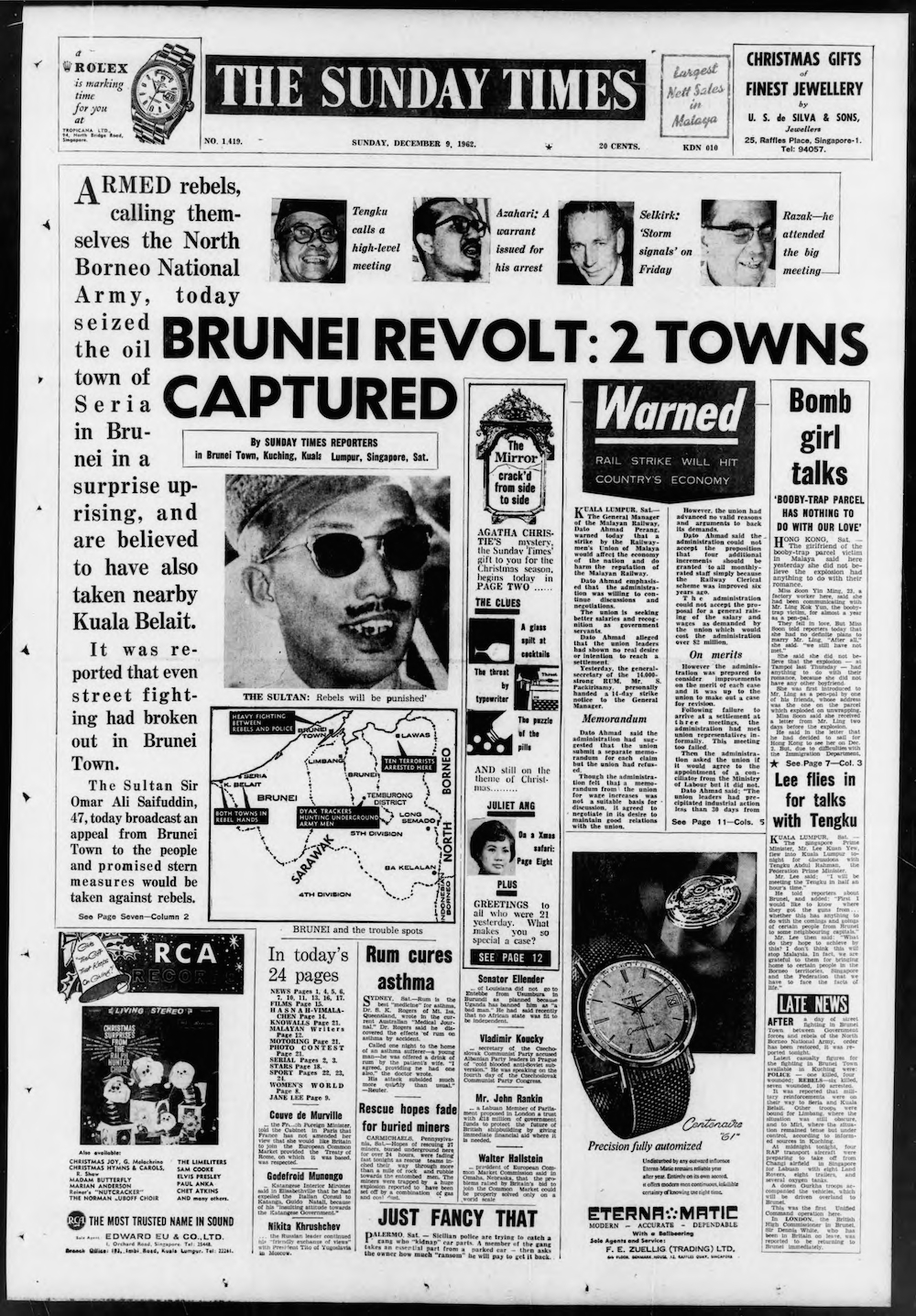 The Brunei revolt (Malay : Pemberontakan Brunei) or the Brunei rebellion of 1962 was a December 1962 insurrection in the British protectorate of Brunei by opponents of its monarchy's proposed inclusion in the Federation of Malaysia. The insurgents were members of the TNKU (North Kalimantan National Army), a militia supplied by Indonesia and linked to the left-wing Brunei People's Party, which favoured a North Borneo Federation. The TNKU began co-ordinated attacks on the oil town of Seria (targeting the Royal Dutch Shell oil installations), on police stations, and on government facilities around the protectorate. The revolt began to break down within hours, having failed to achieve key objectives such as the capture of Brunei Town and Sultan Omar Ali Saifuddien III. [1] The revolt influenced the Sultan's 1963 decision not to join Malaysia. It is seen as one of the first stages of the Indonesia–Malaysia confrontation.