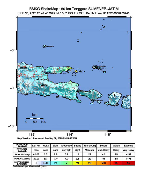 30 [490] | ![]() | 6.0 | 24.2 | VII [491] | Six people injured, 14 structures collapsed and 316 others damaged in Sumenep Regency. [492] [493] [494] Eight buildings damaged in Pamekasan, Situbondo and Jember regencies. [495] [496] [497] A madrasa collapsed in Probolinggo. [498] Additional damage to the collapsed Al-Khoziny Islamic Boarding School in Sidoarjo Regency, hampering rescue efforts. [499] | - | 6 |
