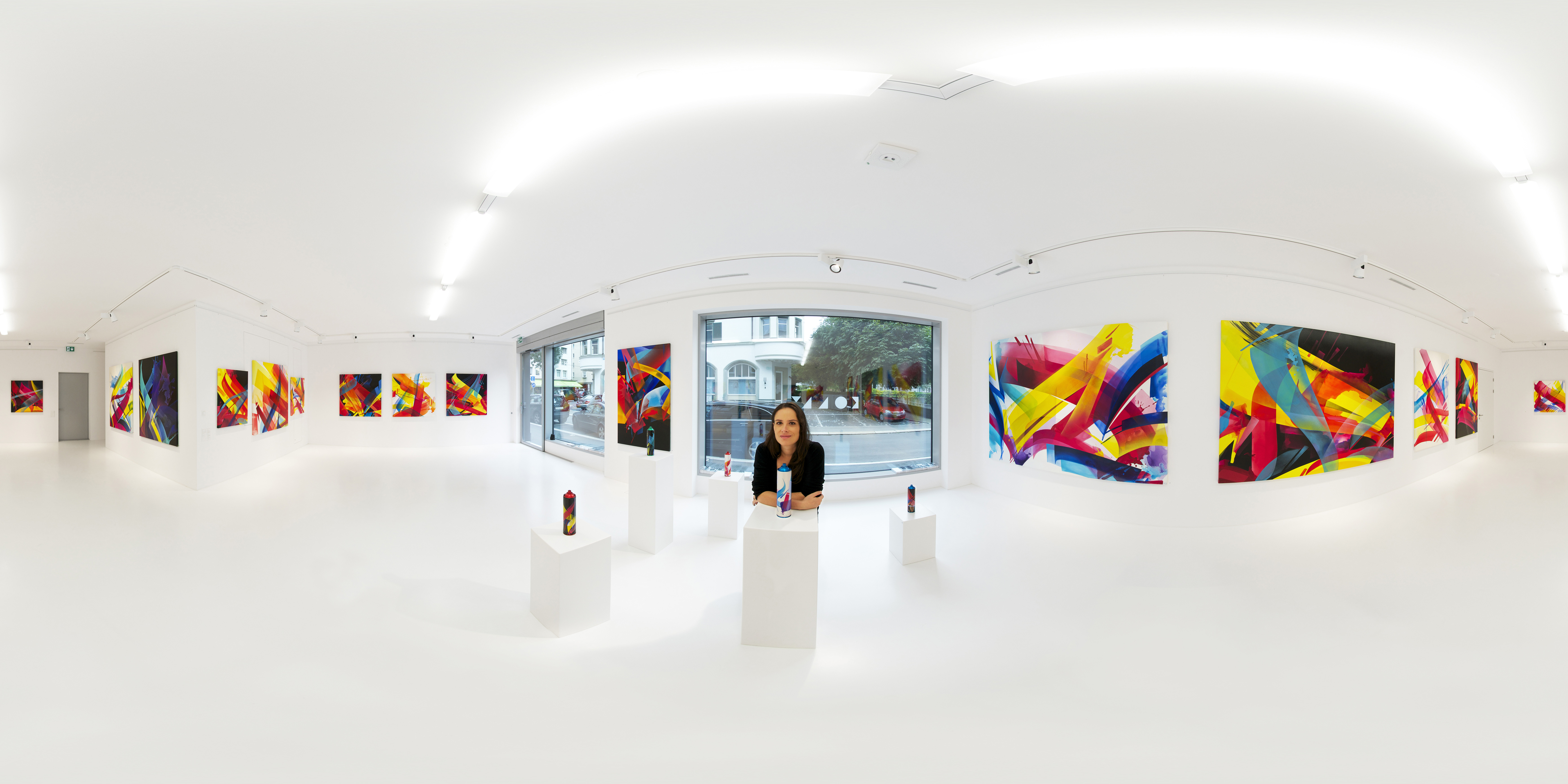 Mad C also works with spray paints on canvas. At her first solo gallery in 2015, Night and Day, she showcased works such as Nineteen Nineteen and Twenty One Zero Six. These works had either a black or white base (symbolic of her night and day work required of her for tagging), and investigated “the relationship between overlapping colors, light, glass and calligraphic movement”. [1] For her canvases she is transferring her philosophy of connecting single parts to one piece – background, foreground, lines and shapes. To create those works, MadC uses spray paint, transparent spray paint, ink, watercolor, acrylic paint and acrylic markers. She paints on canvas, as well as carton, from spray paint boxes.