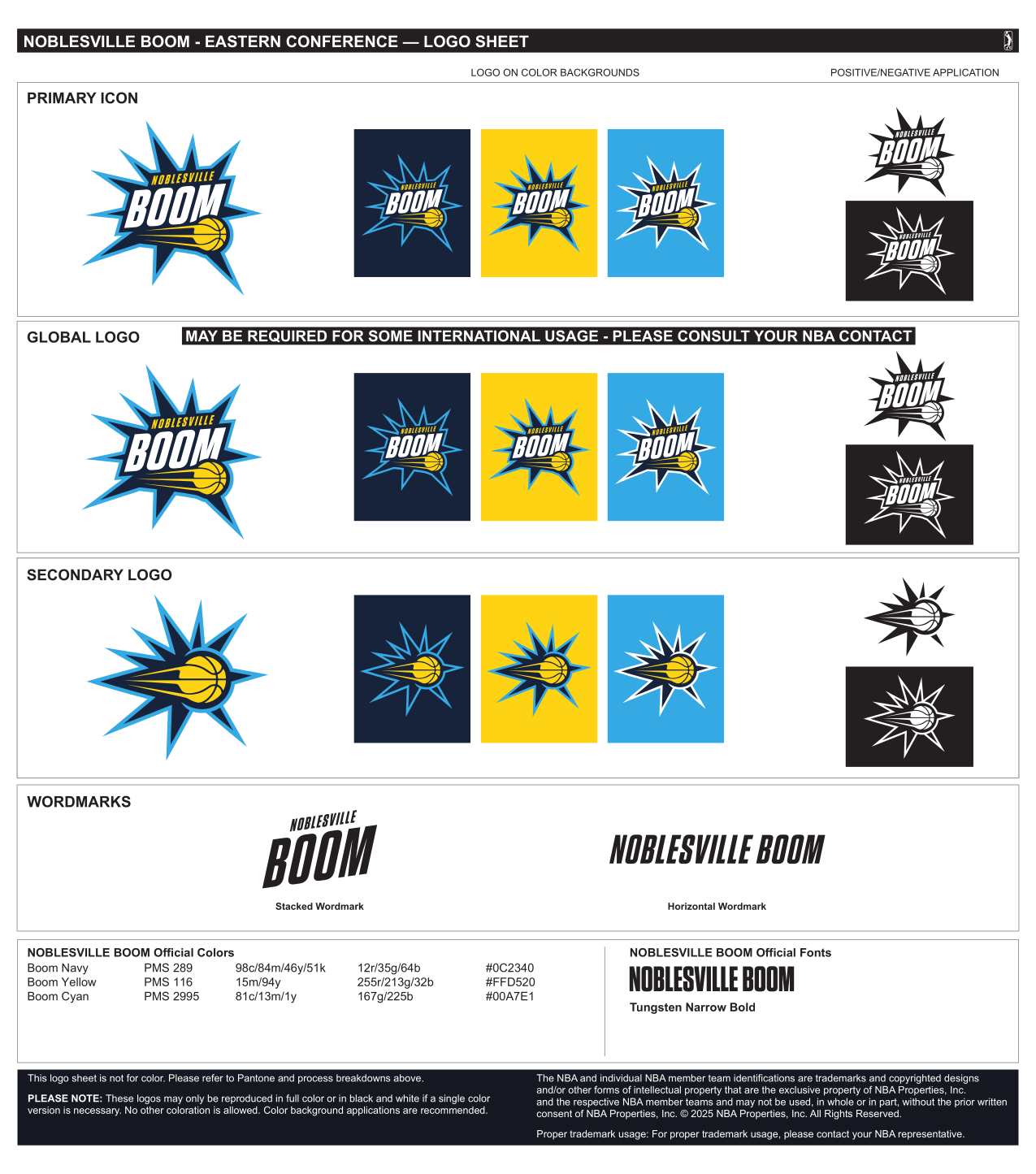 A modern take on the familiar basketball that has defined the Pacers logo for decades, the Noblesville Boom logo includes a supercharged cyan color, first introduced with the Pacers 2023-24 City Edition uniform, alongside the Pacers' classic navy and gold color scheme.