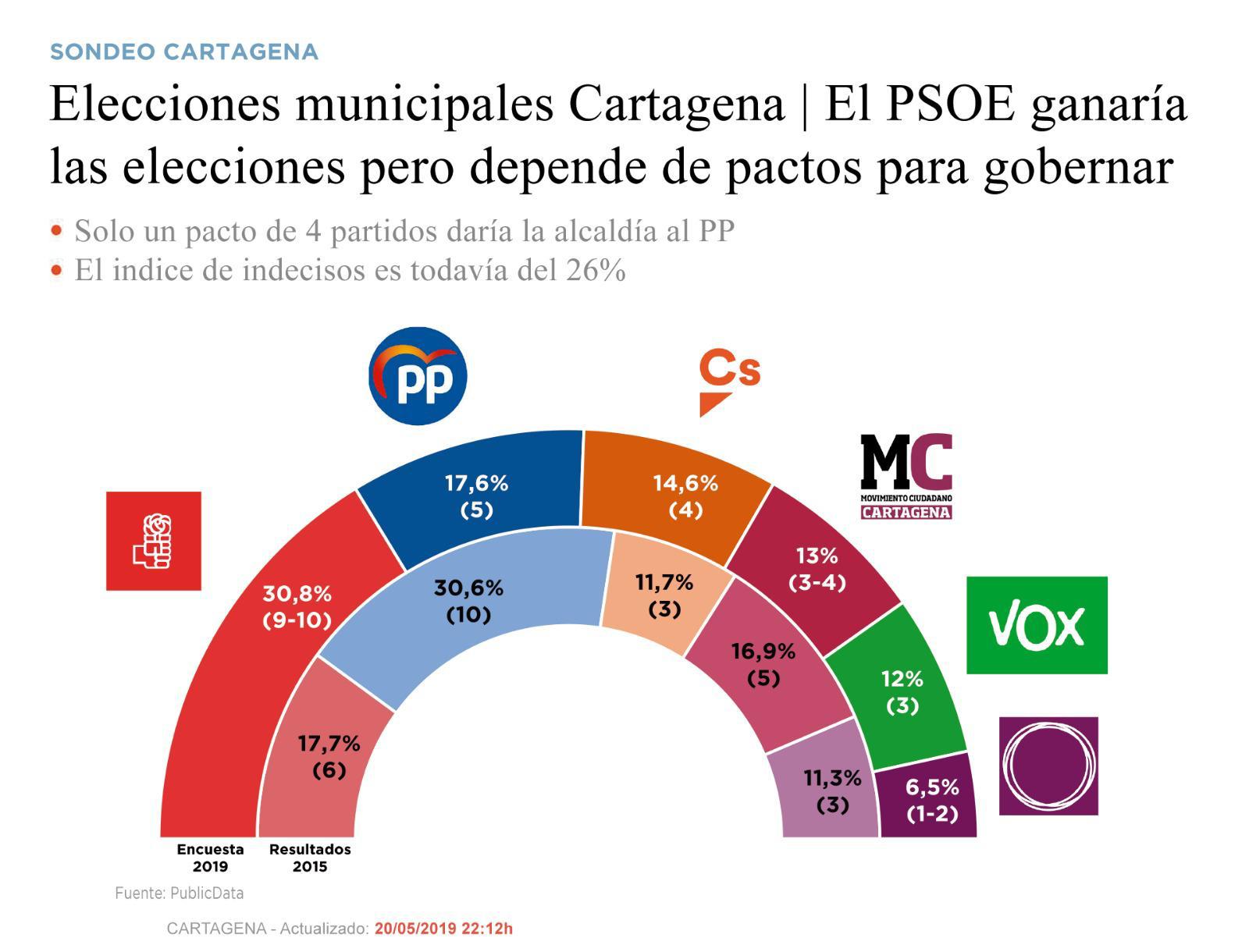 | Sigma Dos/La Verdad [4] | 14–15 May 2019 | 600 | ? | 31.4 10 | 28.7 9/10 | 13.4 4 | 11.3 3 | 3.1 0 | 8.6 2/3 | 2.7 |