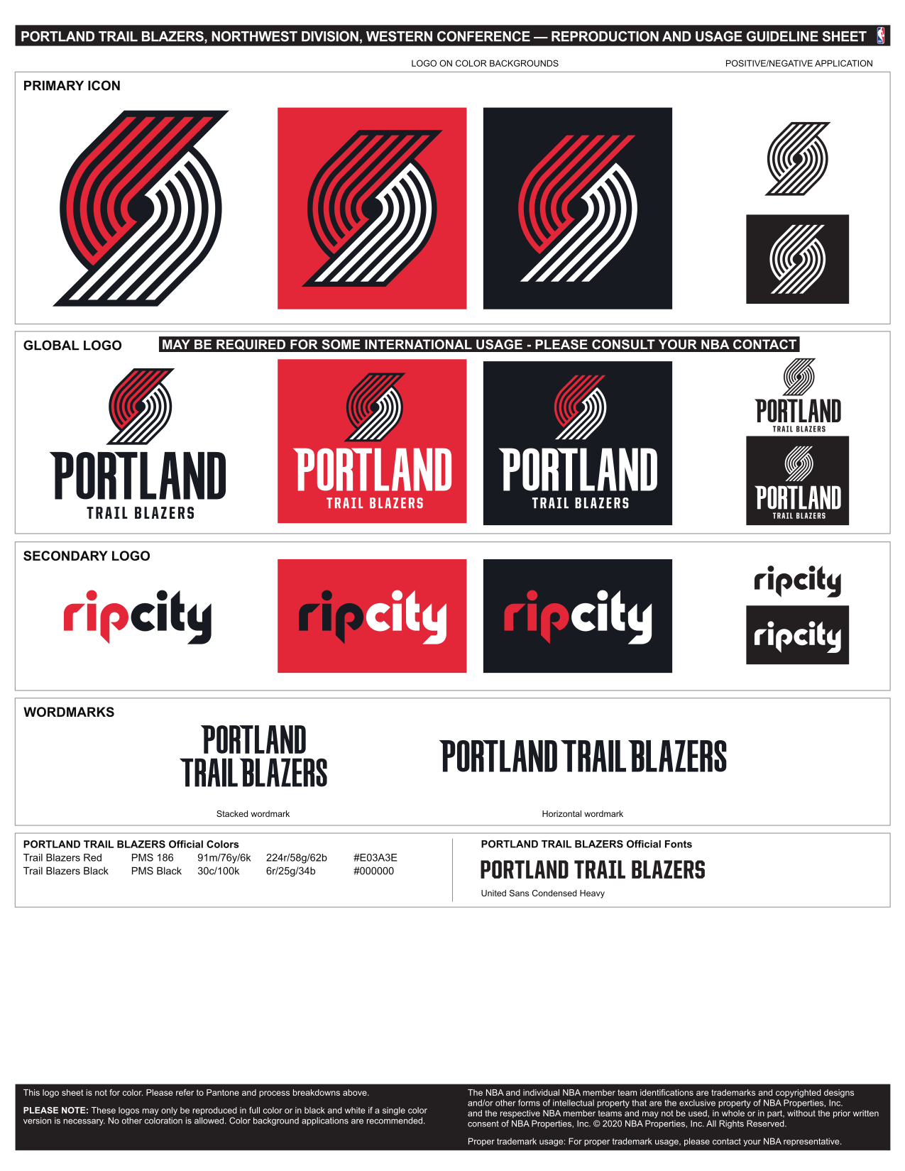 For the 2017–18 season, the Blazers made some slight revisions to their look upon moving to Nike, changing the alignment of the city and team name from italicized to straight while adding the 'Rip City' nickname on the waistband. [167] They also changed their red alternate uniform to include a black and grey variation of the sash inspired from the team's pinwheel logo and a lack of white elements. [168] In the 2019–20 season, the red "Statement" uniform was updated to feature white letters, white numbers with black trim and a thin white strip above the series of black and grey strips. This was due to visibility concerns surrounding the previous red uniform. [169] Then in the 2022–23 season, in collaboration with Damian Lillard, the Trail Blazers updated their "Statement" uniform, only featuring the iconic "pinwheel" logo in black along with black/red side striping inspired by the aforementioned logo. [170] In the 2025–26 season, both the "Association" and "Icon" uniform eliminated the silver accents and the contrasting neck and armhole striping. [171]