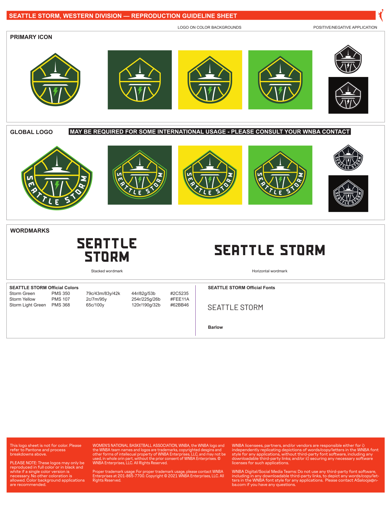 In March 2021, the team released an entirely new logo and updated color scheme. The Space Needle, depicted in a new, more minimalist style, is interlinked with the ribs of a basketball and incorporates a small lightning bolt into the tower. The logo has a pointed shape, meant to evoke Mount Rainier. A sleeker modern font and the new color scheme of dark green, yellow, and bright green are used. [1]