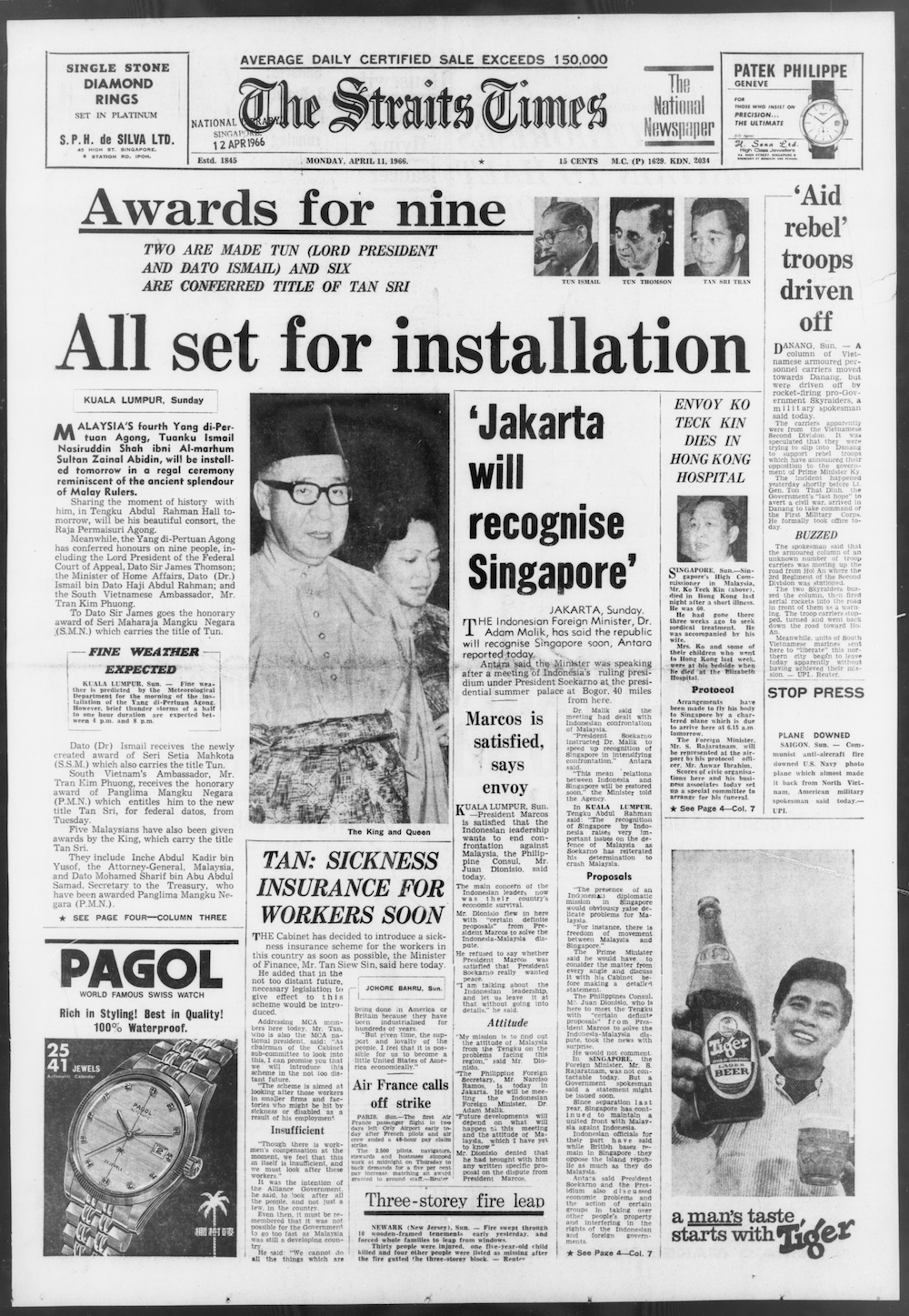 198. "'Jakarta will recognise Singapore'". The Straits Times. 11 April 1966. p. 1.