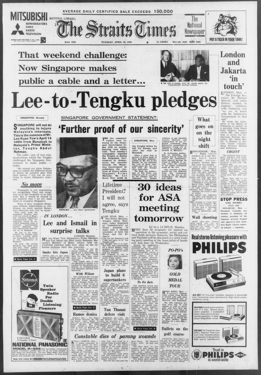 203. "Lee-to-Tengku pledges". The Straits Times. 26 April 1966. p. 1.